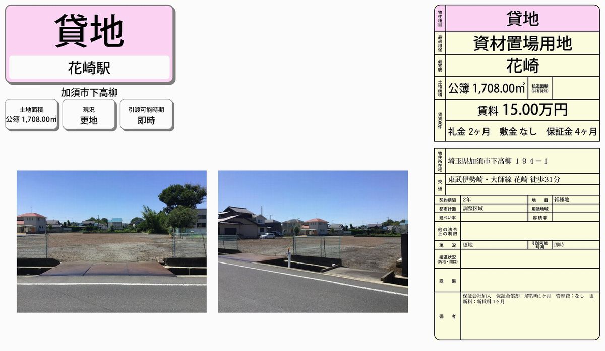 埼玉県加須市下高柳194-1 (花崎) 花崎 貸地 詳細データ
