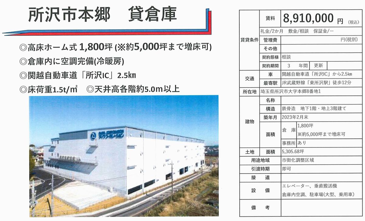 埼玉県所沢市本郷8-1(埼玉県)の貸し倉庫・貸し工場をはじめ埼玉全域の貸し倉庫・貸し工場を検索できます。所沢市本郷8-1(埼玉県)の事務所付貸倉庫、クレーン付工場、店舗倉庫、工業専用地域等、ニーズに合わせて簡単検索。所沢市本郷8-1(埼玉県)の貸し倉庫・貸し工場を貸したい方にはオーナーサポートシステムで無料にて査定・掲載いたします。所沢市本郷8-1(埼玉県)で貸し倉庫・貸し工場をご契約のテナント様には貸し倉庫・貸し工場の設計変更、造作のご相談・施工も承ります。貸し倉庫・貸し工場で移転・新規開設をするなら埼玉地区最大級のテナント.com! |