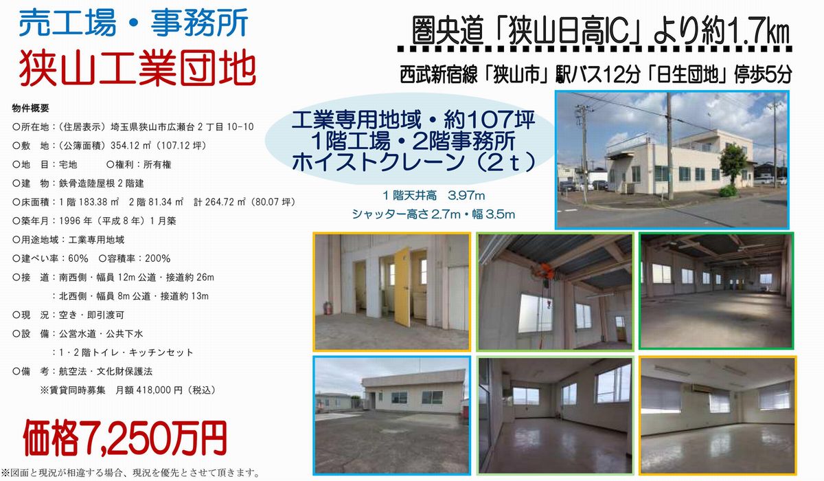 埼玉県内の貸し倉庫・貸し工場の情報満載(トップ) > 埼玉のエリアで探す > 狭山市 > 狭山市 > 狭山市広瀬台2-10-10 狭山市 売工場