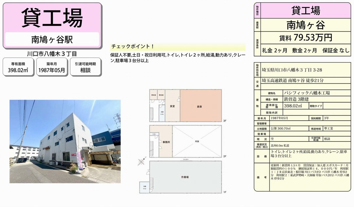 埼玉県川口市八幡木3-3-28 (南鳩ヶ谷) パシフィック八幡木工場 詳細データ