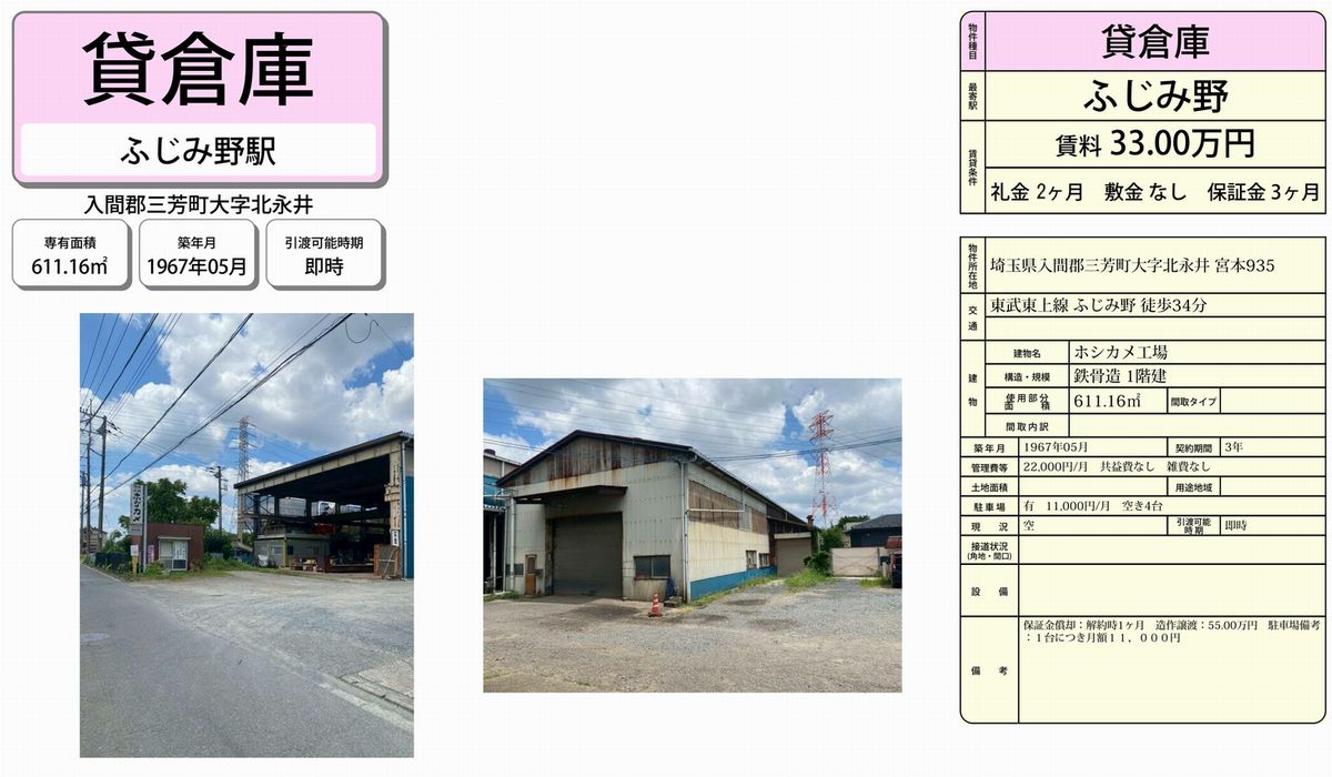 埼玉県内の貸し倉庫・貸し工場の情報満載(トップ) > 埼玉のエリアで探す > 入間郡三芳町 > ふじみ野 > 入間郡三芳町北永井935 ホシカメ工場