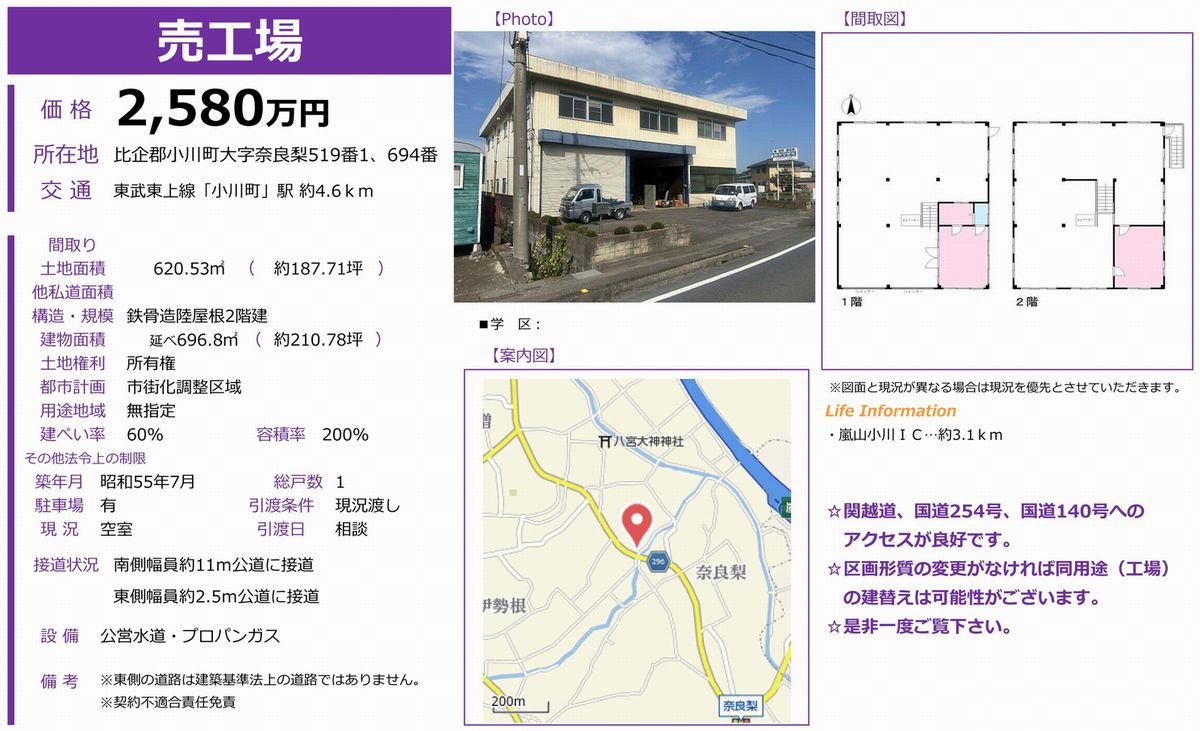 埼玉県比企郡小川町大字奈良梨519-1 (小川町) 小川町 売工場 詳細データ