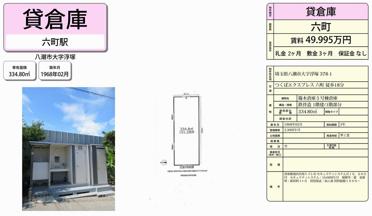 埼玉県八潮市浮塚378-1 (六町) 篠木倉庫5号棟倉庫 詳細データ