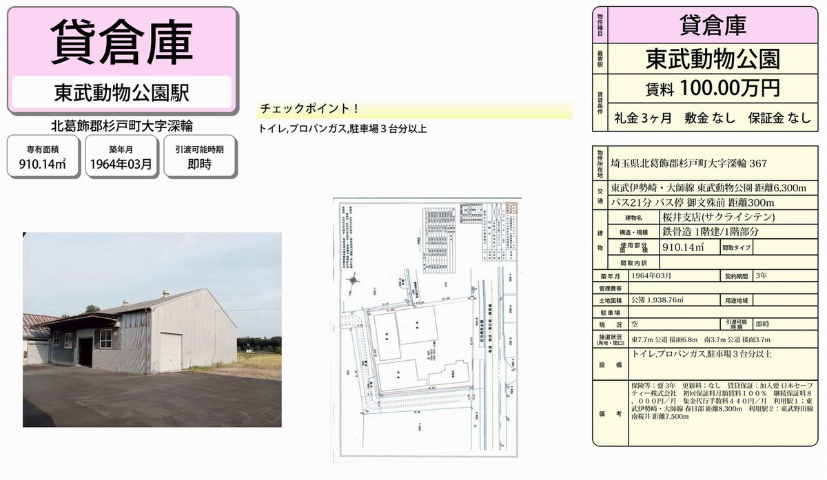 埼玉県内の貸し倉庫・貸し工場の情報満載(トップ) > 埼玉のエリアで探す > 北葛飾郡杉戸町 > 東武動物公園 > 北葛飾郡杉戸町深輪367 桜井支店