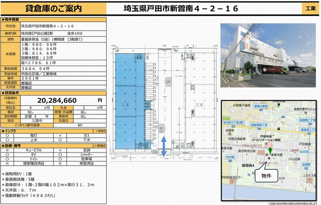 埼玉県戸田市新曽南4-2-16(埼玉県)の貸し倉庫・貸し工場をはじめ埼玉全域の貸し倉庫・貸し工場を検索できます。戸田市新曽南4-2-16(埼玉県)の事務所付貸倉庫、クレーン付工場、店舗倉庫、工業専用地域等、ニーズに合わせて簡単検索。戸田市新曽南4-2-16(埼玉県)の貸し倉庫・貸し工場を貸したい方にはオーナーサポートシステムで無料にて査定・掲載いたします。戸田市新曽南4-2-16(埼玉県)で貸し倉庫・貸し工場をご契約のテナント様には貸し倉庫・貸し工場の設計変更、造作のご相談・施工も承ります。貸し倉庫・貸し工場で移転・新規開設をするなら埼玉地区最大級のテナント.com! |