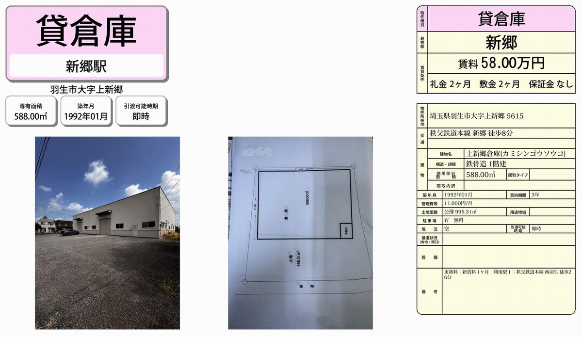 埼玉県羽生市上新郷5615 (新郷) 上新郷倉庫 詳細データ
