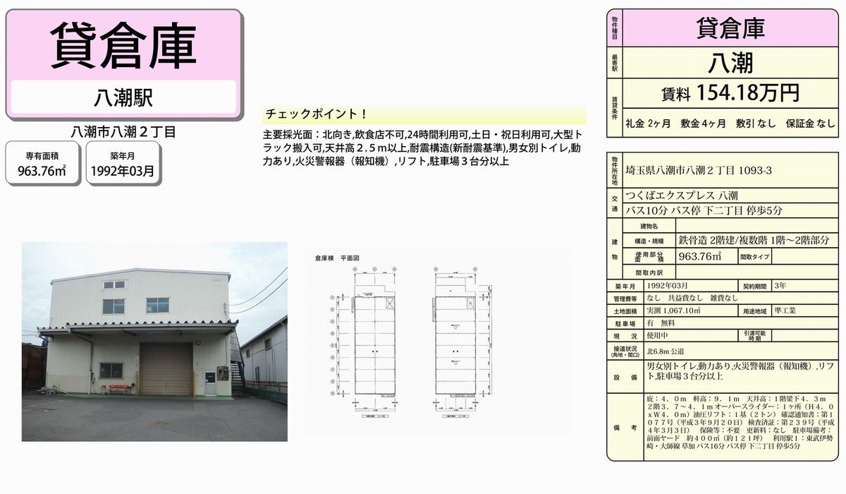 埼玉県八潮市大字二丁目1093-3 (八潮) 八潮 貸倉庫 詳細データ