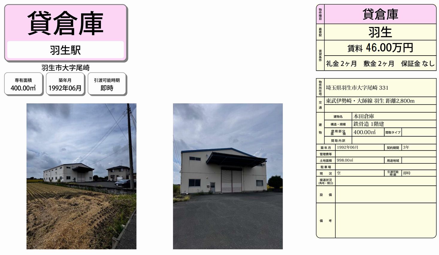 埼玉県羽生市尾崎331 (羽生) 本田倉庫 詳細データ