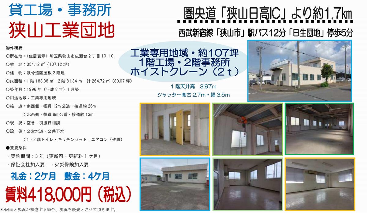 埼玉県狭山市広瀬台2-10-10(埼玉県)の貸し倉庫・貸し工場をはじめ埼玉全域の貸し倉庫・貸し工場を検索できます。狭山市広瀬台2-10-10(埼玉県)の事務所付貸倉庫、クレーン付工場、店舗倉庫、工業専用地域等、ニーズに合わせて簡単検索。狭山市広瀬台2-10-10(埼玉県)の貸し倉庫・貸し工場を貸したい方にはオーナーサポートシステムで無料にて査定・掲載いたします。狭山市広瀬台2-10-10(埼玉県)で貸し倉庫・貸し工場をご契約のテナント様には貸し倉庫・貸し工場の設計変更、造作のご相談・施工も承ります。貸し倉庫・貸し工場で移転・新規開設をするなら埼玉地区最大級のテナント.com! |