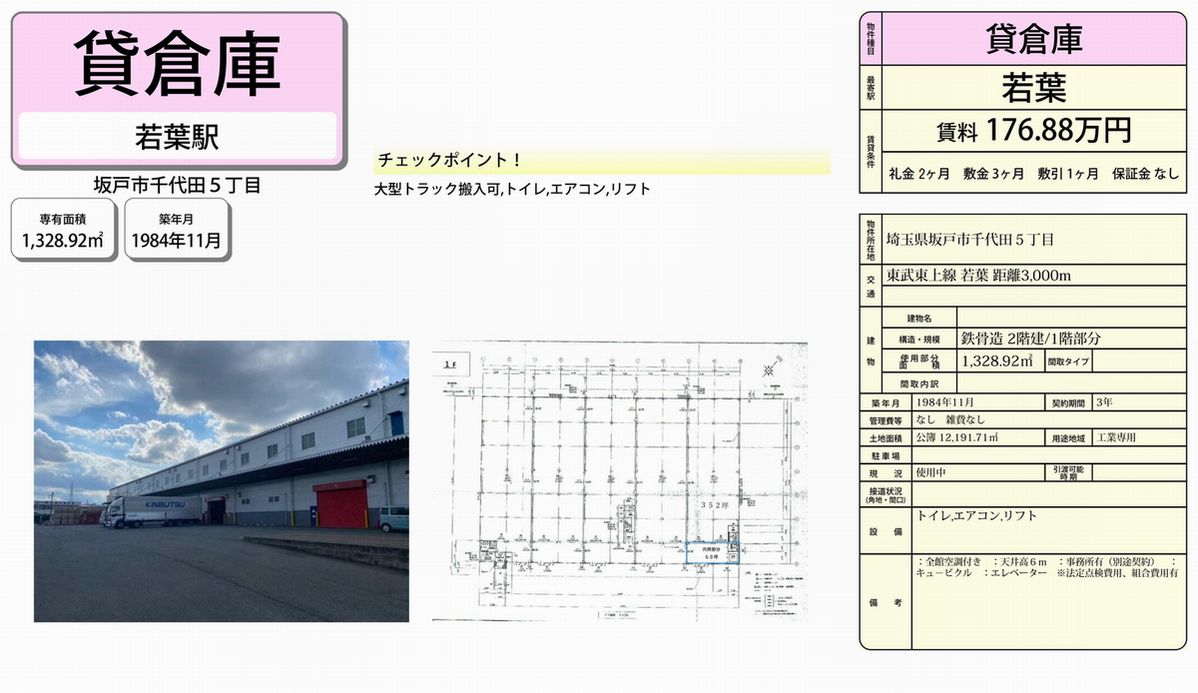 埼玉県坂戸市千代田5-7-20(埼玉県)の貸し倉庫・貸し工場をはじめ埼玉全域の貸し倉庫・貸し工場を検索できます。坂戸市千代田5-7-20(埼玉県)の事務所付貸倉庫、クレーン付工場、店舗倉庫、工業専用地域等、ニーズに合わせて簡単検索。坂戸市千代田5-7-20(埼玉県)の貸し倉庫・貸し工場を貸したい方にはオーナーサポートシステムで無料にて査定・掲載いたします。坂戸市千代田5-7-20(埼玉県)で貸し倉庫・貸し工場をご契約のテナント様には貸し倉庫・貸し工場の設計変更、造作のご相談・施工も承ります。貸し倉庫・貸し工場で移転・新規開設をするなら埼玉地区最大級のテナント.com! |