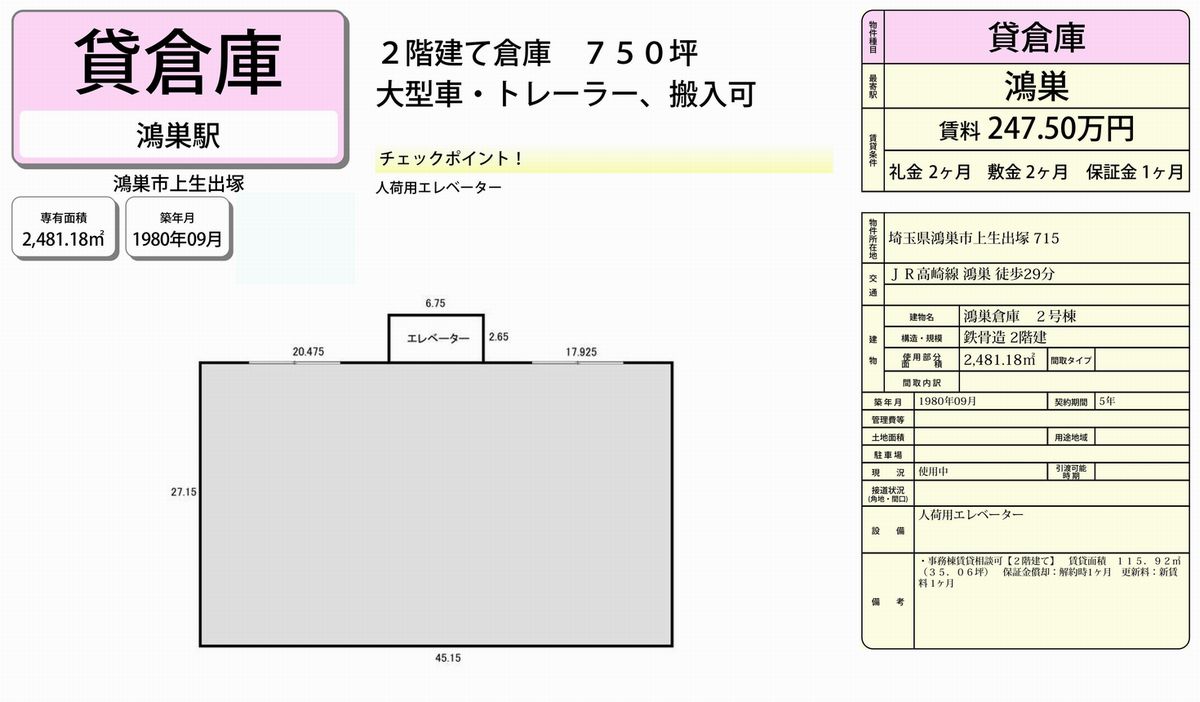 | 備考 | 人荷用エレベーター 大型トレーラー搬入可 2階建て事務所賃貸相談可 |