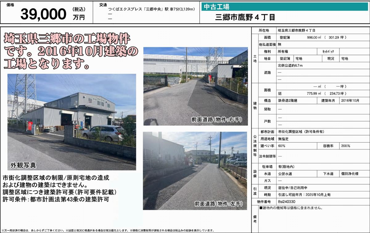 | 備考 | 売買物件 39,000万円 建ぺい率60% 容積率200% 調整区域 |