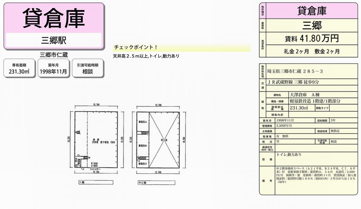 埼玉県三郷市仁蔵285-3 (三郷) 大澤倉庫A棟 詳細データ