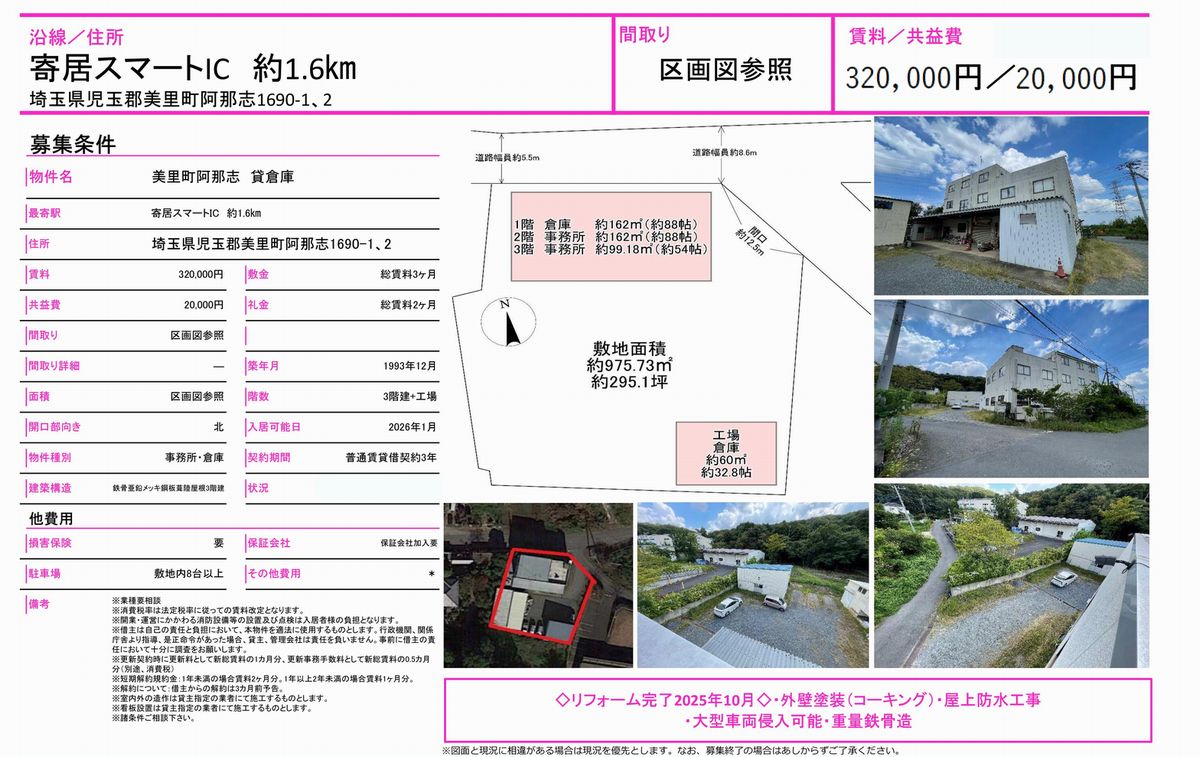 埼玉県児玉郡美里町阿那志1690-1(埼玉県)の貸し倉庫・貸し工場をはじめ埼玉全域の貸し倉庫・貸し工場を検索できます。児玉郡美里町阿那志1690-1(埼玉県)の事務所付貸倉庫、クレーン付工場、店舗倉庫、工業専用地域等、ニーズに合わせて簡単検索。児玉郡美里町阿那志1690-1(埼玉県)の貸し倉庫・貸し工場を貸したい方にはオーナーサポートシステムで無料にて査定・掲載いたします。児玉郡美里町阿那志1690-1(埼玉県)で貸し倉庫・貸し工場をご契約のテナント様には貸し倉庫・貸し工場の設計変更、造作のご相談・施工も承ります。貸し倉庫・貸し工場で移転・新規開設をするなら埼玉地区最大級のテナント.com! |