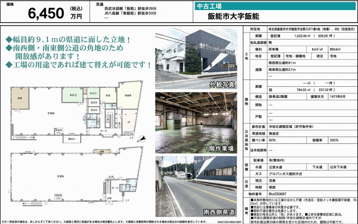 | 備考 | 売買物件 6,450万円 建ぺい率60% 容積率200% 市街化調整区域 |