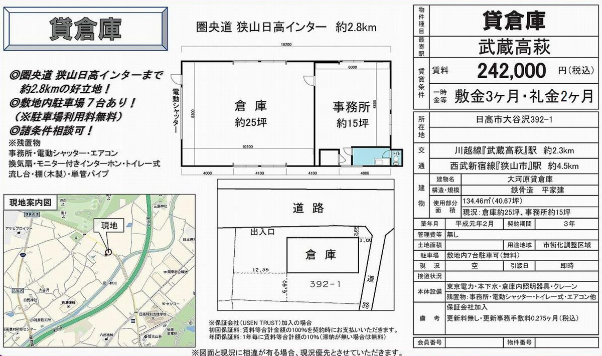 埼玉県日高市大字大谷沢392-1 (武蔵高萩) 大河原貸倉庫 詳細データ