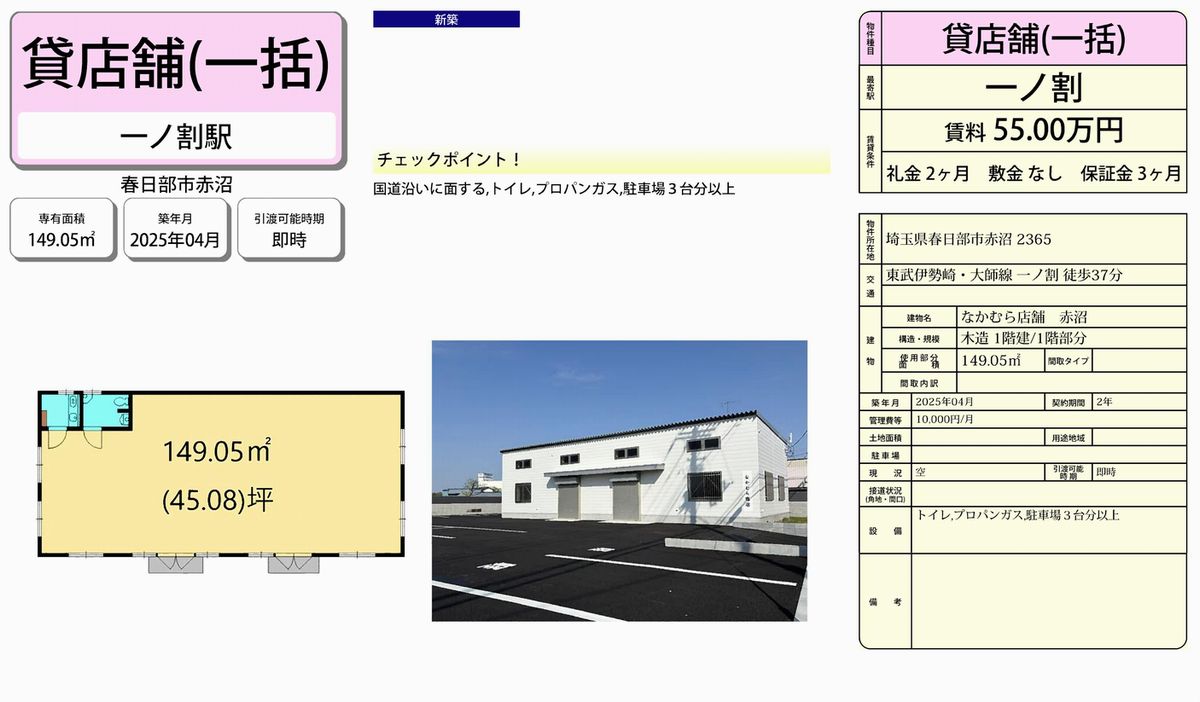 埼玉県春日部市赤沼2365 (一ノ割) なかむら店舗 詳細データ