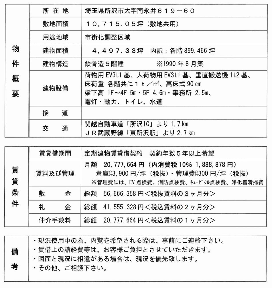 埼玉県所沢市大字南永井619-60 (東所沢) 東所沢 貸倉庫 一棟貸 詳細データ