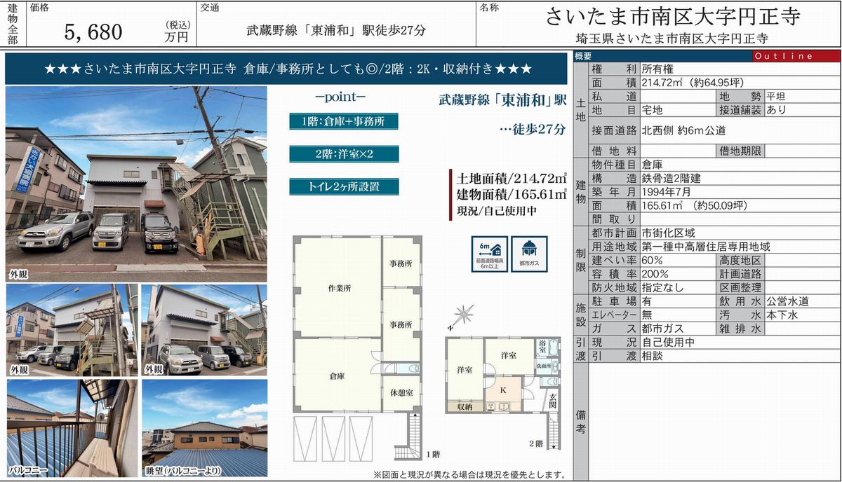 埼玉県さいたま市南区大字円正寺 (東浦和) 東浦和 売倉庫 詳細データ