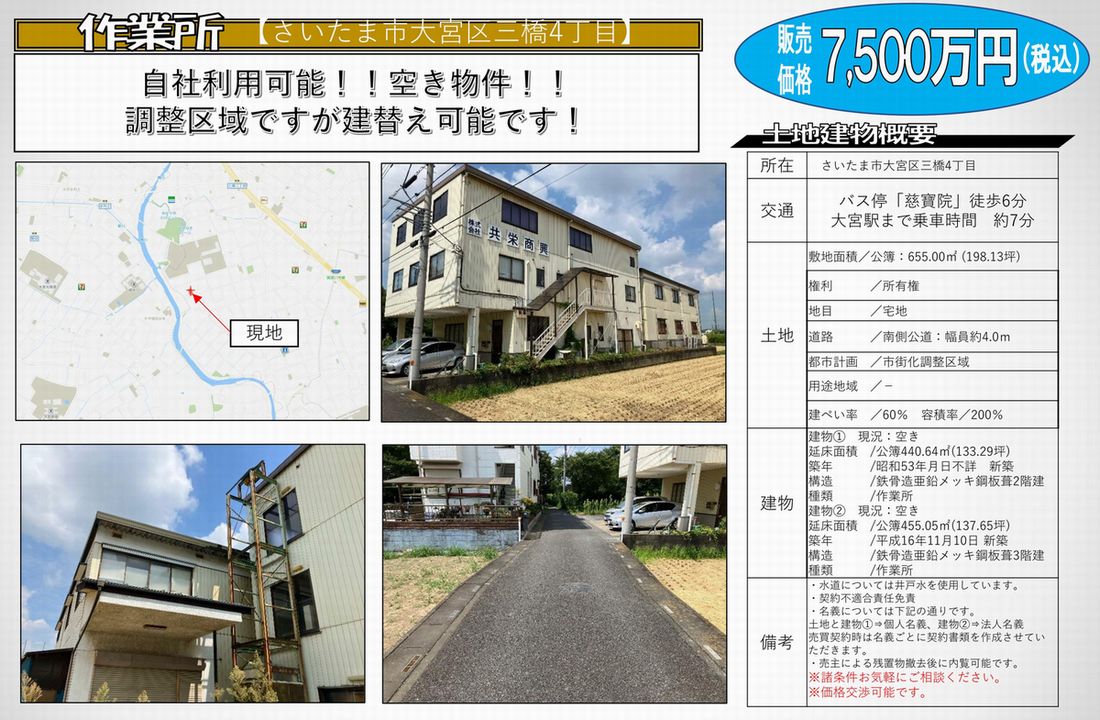 | 備考 | 売買物件 7,500万円 建ぺい率60% 容積率200% 調整区域 |