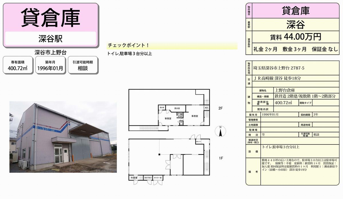 埼玉県深谷市上野台2787-5 (深谷) 上野台倉庫 詳細データ