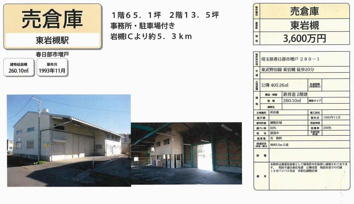 埼玉県春日部市増戸280-1 (東岩槻) 東岩槻 売倉庫 詳細データ