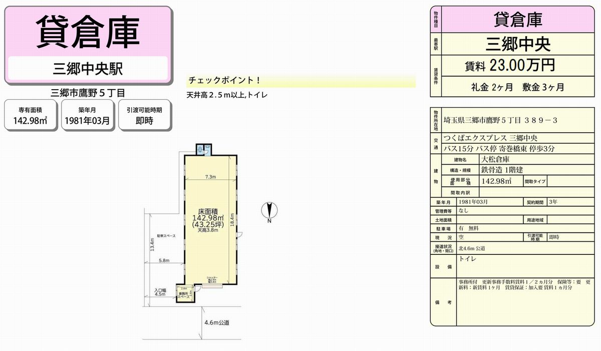 埼玉県三郷市鷹野5-389-3 (三郷中央) 大松倉庫 詳細データ