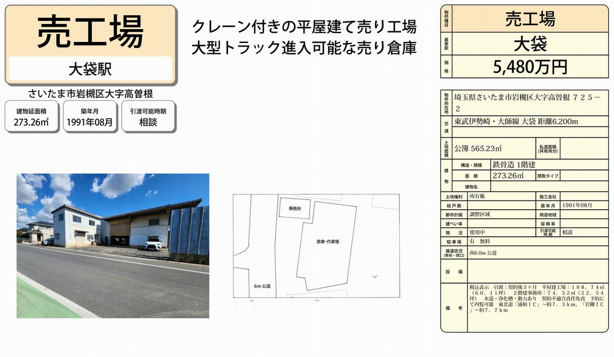 | 備考 | 売買物件 5,480万円 調整区域 クレーン付き 事務所有 |