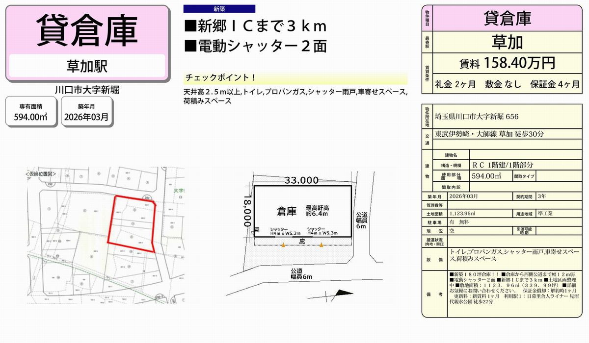 埼玉県川口市新堀656 (草加) 草加 貸倉庫 詳細データ