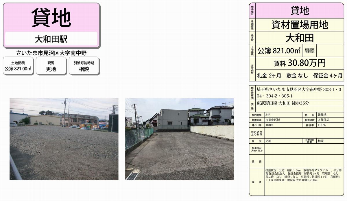 埼玉県さいたま市見沼区大字南中野303-1 (大和田) 大和田 貸地 詳細データ