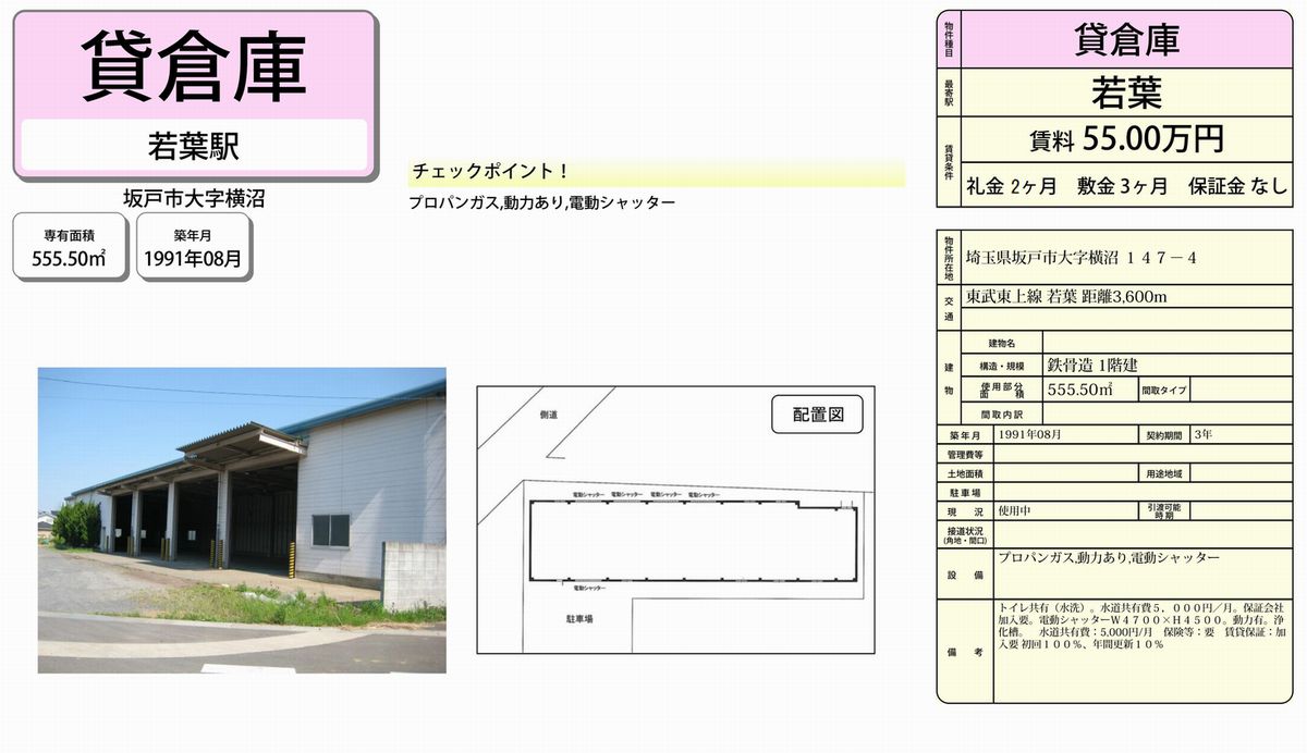 埼玉県坂戸市横沼147-4 (若葉) 若葉 貸倉庫 詳細データ