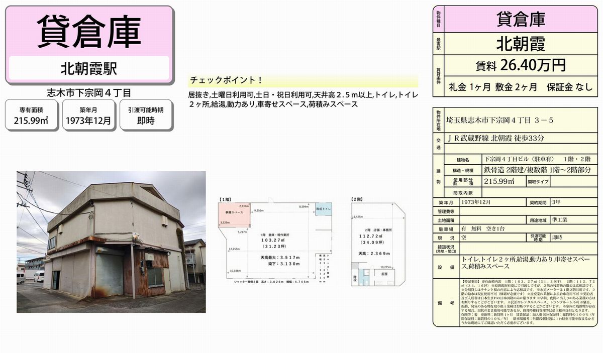 埼玉県内の貸し倉庫・貸し工場の情報満載(トップ) > 埼玉のエリアで探す > 志木市 > 北朝霞 > 志木市下宗岡4-3-5 下宗岡4丁目ビル
