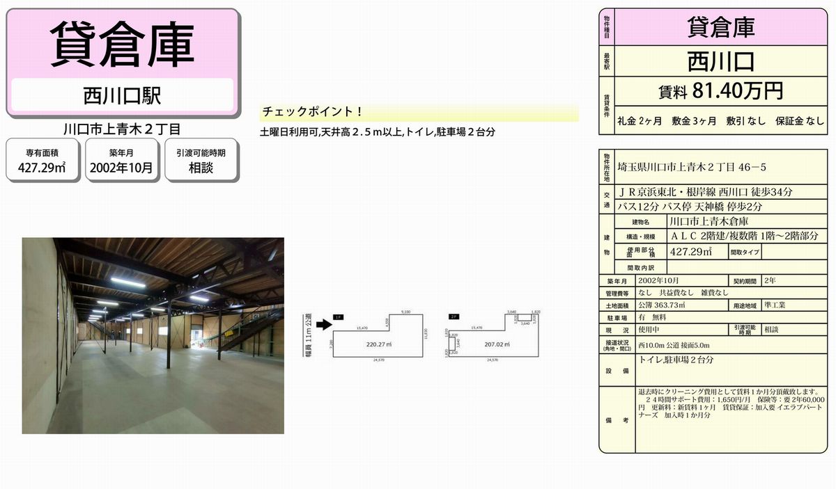 埼玉県川口市上青木2-46-5 (西川口) 西川口 貸倉庫 詳細データ