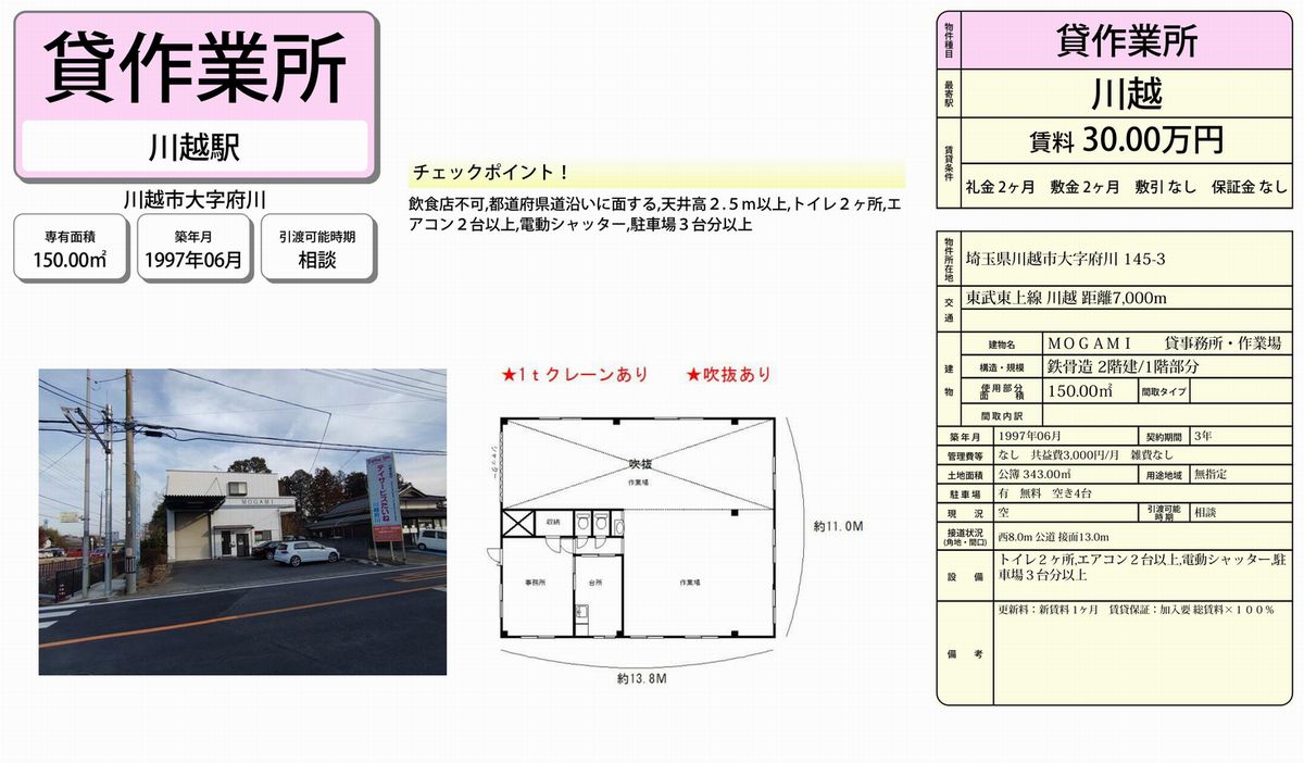埼玉県川越市府川145-3(埼玉県)の貸し倉庫・貸し工場をはじめ埼玉全域の貸し倉庫・貸し工場を検索できます。川越市府川145-3(埼玉県)の事務所付貸倉庫、クレーン付工場、店舗倉庫、工業専用地域等、ニーズに合わせて簡単検索。川越市府川145-3(埼玉県)の貸し倉庫・貸し工場を貸したい方にはオーナーサポートシステムで無料にて査定・掲載いたします。川越市府川145-3(埼玉県)で貸し倉庫・貸し工場をご契約のテナント様には貸し倉庫・貸し工場の設計変更、造作のご相談・施工も承ります。貸し倉庫・貸し工場で移転・新規開設をするなら埼玉地区最大級のテナント.com! |