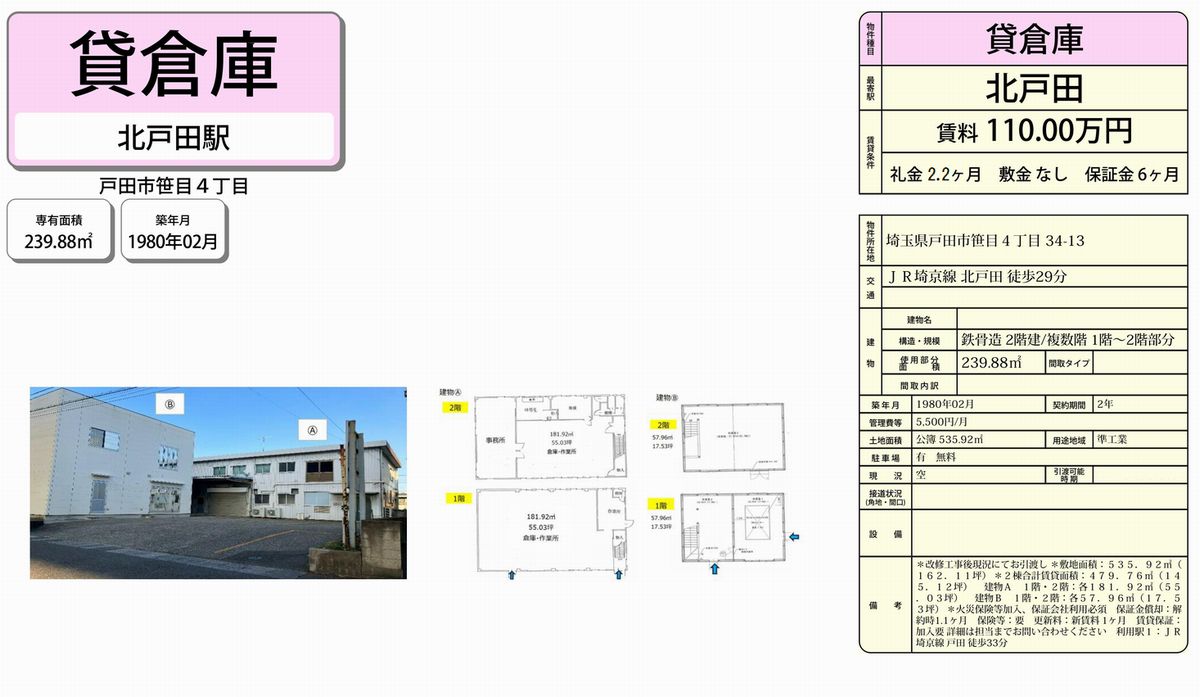 埼玉県戸田市笹目4-34-13 (北戸田) 北戸田 貸倉庫 詳細データ