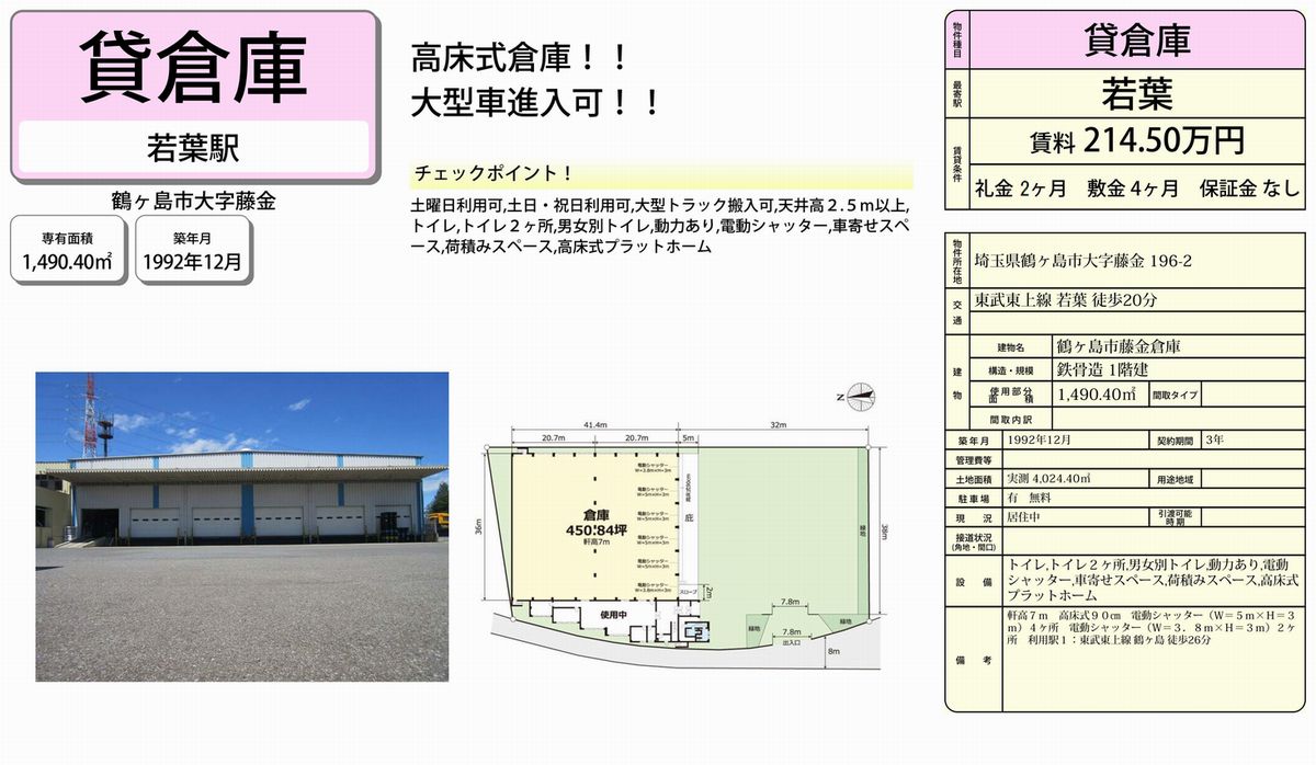 | 備考 | 電動シャッター 高床式倉庫 大型車進入可 男女別トイレ |