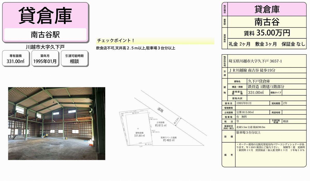 埼玉県川越市久下戸3657-1 (南古谷) 南古谷 貸倉庫 詳細データ
