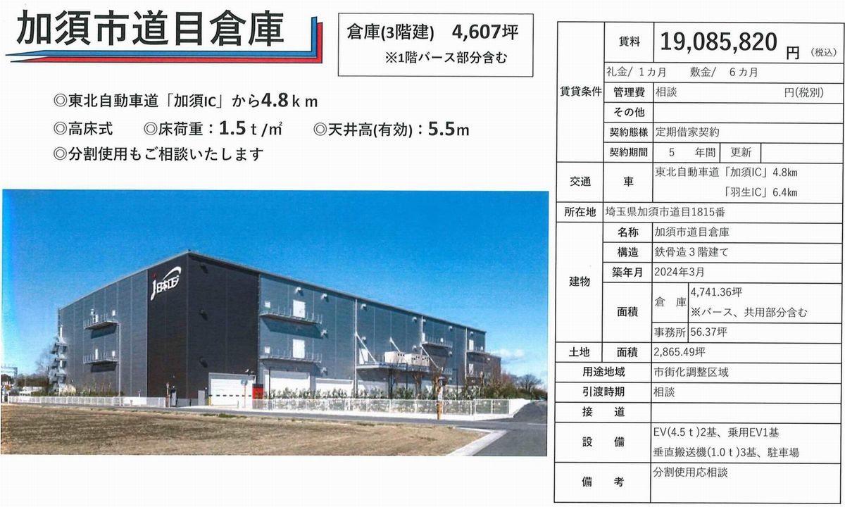 埼玉県加須市道目1815(埼玉県)の貸し倉庫・貸し工場をはじめ埼玉全域の貸し倉庫・貸し工場を検索できます。加須市道目1815(埼玉県)の事務所付貸倉庫、クレーン付工場、店舗倉庫、工業専用地域等、ニーズに合わせて簡単検索。加須市道目1815(埼玉県)の貸し倉庫・貸し工場を貸したい方にはオーナーサポートシステムで無料にて査定・掲載いたします。加須市道目1815(埼玉県)で貸し倉庫・貸し工場をご契約のテナント様には貸し倉庫・貸し工場の設計変更、造作のご相談・施工も承ります。貸し倉庫・貸し工場で移転・新規開設をするなら埼玉地区最大級のテナント.com!