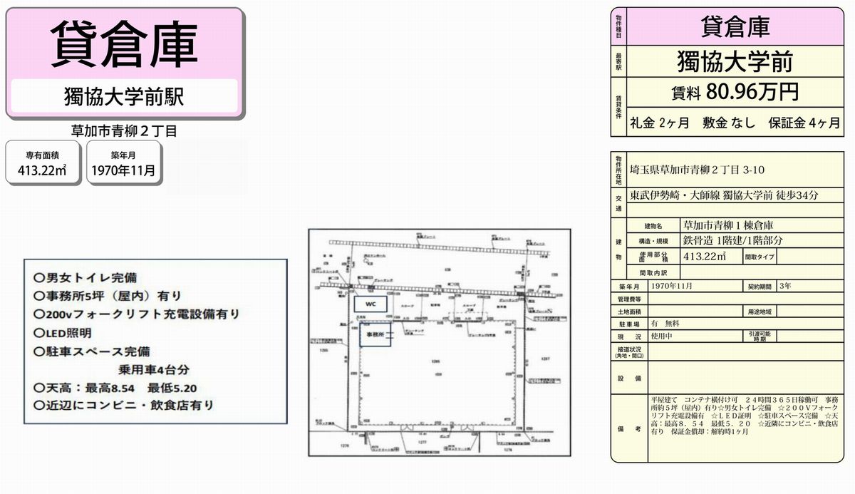 埼玉県草加市青柳2-3-10 (獨協大学前) 獨協大学前 倉庫 詳細データ