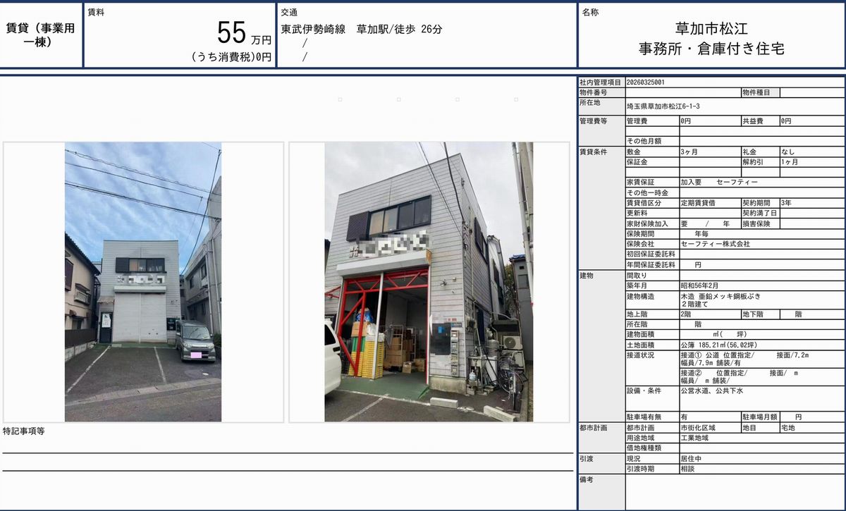 埼玉県草加市松江6-1-3(埼玉県)の貸し倉庫・貸し工場をはじめ埼玉全域の貸し倉庫・貸し工場を検索できます。草加市松江6-1-3(埼玉県)の事務所付貸倉庫、クレーン付工場、店舗倉庫、工業専用地域等、ニーズに合わせて簡単検索。草加市松江6-1-3(埼玉県)の貸し倉庫・貸し工場を貸したい方にはオーナーサポートシステムで無料にて査定・掲載いたします。草加市松江6-1-3(埼玉県)で貸し倉庫・貸し工場をご契約のテナント様には貸し倉庫・貸し工場の設計変更、造作のご相談・施工も承ります。貸し倉庫・貸し工場で移転・新規開設をするなら埼玉地区最大級のテナント.com! |