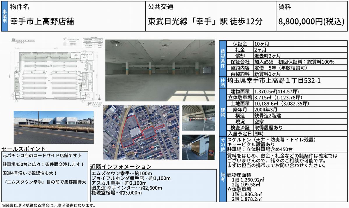 埼玉県幸手市上高野1-532-1(埼玉県)の貸し倉庫・貸し工場をはじめ埼玉全域の貸し倉庫・貸し工場を検索できます。幸手市上高野1-532-1(埼玉県)の事務所付貸倉庫、クレーン付工場、店舗倉庫、工業専用地域等、ニーズに合わせて簡単検索。幸手市上高野1-532-1(埼玉県)の貸し倉庫・貸し工場を貸したい方にはオーナーサポートシステムで無料にて査定・掲載いたします。幸手市上高野1-532-1(埼玉県)で貸し倉庫・貸し工場をご契約のテナント様には貸し倉庫・貸し工場の設計変更、造作のご相談・施工も承ります。貸し倉庫・貸し工場で移転・新規開設をするなら埼玉地区最大級のテナント.com!
