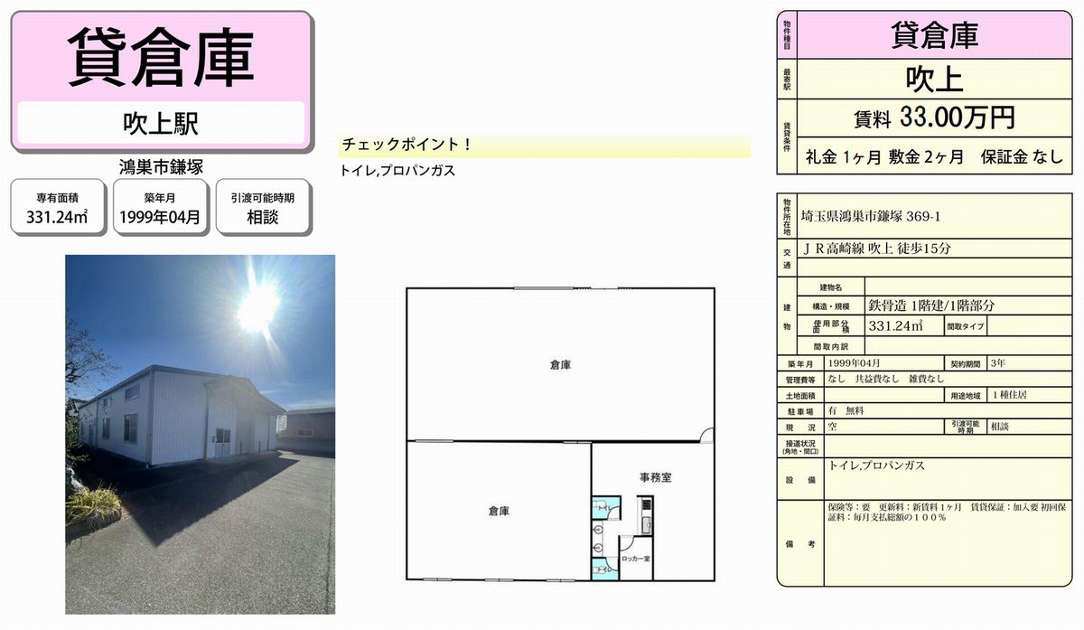 埼玉県鴻巣市鎌塚369-1 (吹上) 吹上 貸倉庫 詳細データ