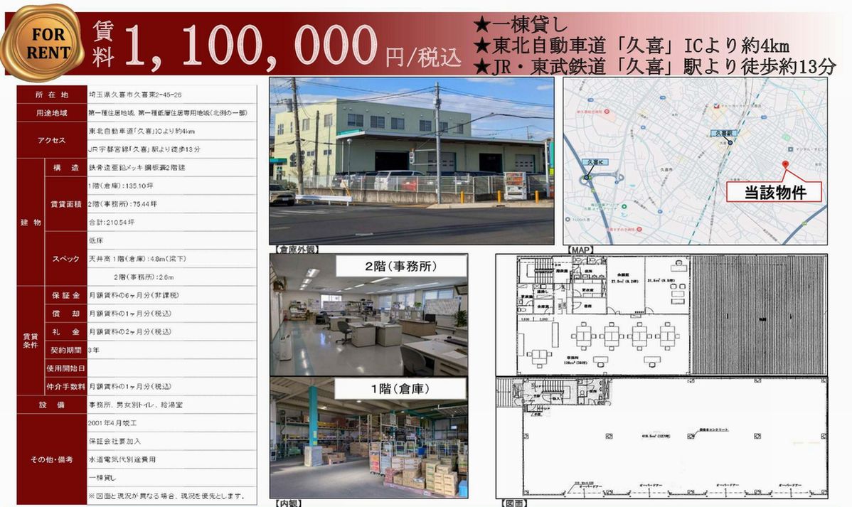 埼玉県久喜市久喜東2-45 (久喜) 久喜 貸倉庫 詳細データ