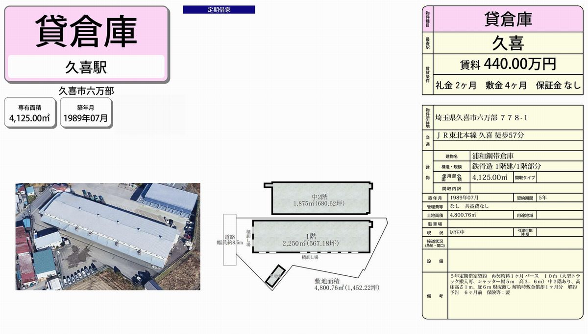 埼玉県久喜市六万部778-1 (久喜) 久喜 貸倉庫 詳細データ