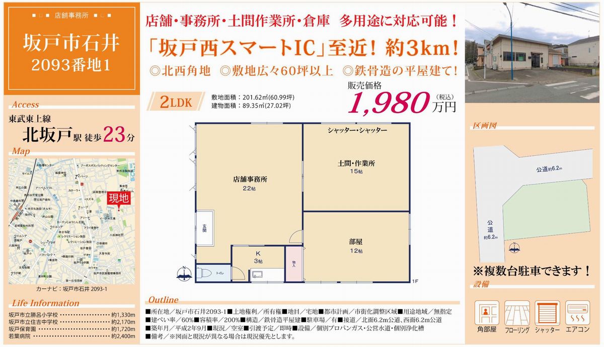 | 備考 | 売買物件 1,980万円 建ぺい率60% 容積率200% 市街化調整区域 |