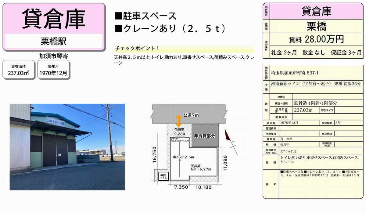 | 備考 | クレーン2.5t トイレ 駐車スペース有 シャッター |