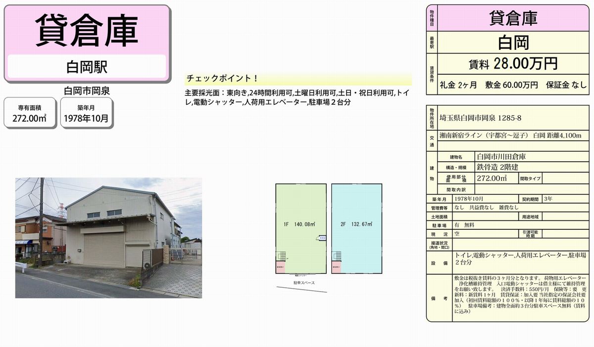 埼玉県白岡市岡泉1285-8(埼玉県)の貸し倉庫・貸し工場をはじめ埼玉全域の貸し倉庫・貸し工場を検索できます。白岡市岡泉1285-8(埼玉県)の事務所付貸倉庫、クレーン付工場、店舗倉庫、工業専用地域等、ニーズに合わせて簡単検索。白岡市岡泉1285-8(埼玉県)の貸し倉庫・貸し工場を貸したい方にはオーナーサポートシステムで無料にて査定・掲載いたします。白岡市岡泉1285-8(埼玉県)で貸し倉庫・貸し工場をご契約のテナント様には貸し倉庫・貸し工場の設計変更、造作のご相談・施工も承ります。貸し倉庫・貸し工場で移転・新規開設をするなら埼玉地区最大級のテナント.com! |