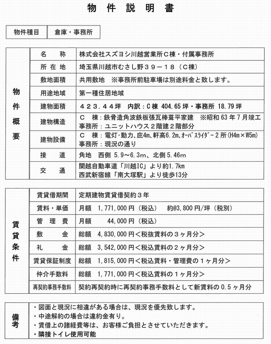 | 備考 | オーバースライダー 隣接トイレ使用可能 事務所 |